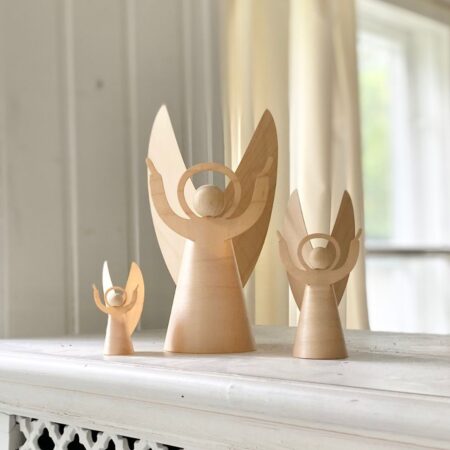 Valonan puiset enkelit, uutuustuotteemme, on valmistettu vastuullisesti suomalaisesta taipuisasta koivuvanerista. Enkelikoristeet tuovat luonnollista tunnelmaa tilaan ja sopivat moniin eri käyttötarkoituksiin. Puiset enkelit sopivat joulukoristeiksi, mutta toimivat myös tunnelmallisina lahjoina ja sisustuselementteinä esimerkiksi ristiäisissä tai muistotilaisuuksissa. Ne voi ripustaa joulukuuseen, sijoittaa pöydälle tai hyllylle luomaan kodikasta tunnelmaa. Valikoimassamme on enkeleitä eri kokoisina, ja osa malleista toimitetaan helposti lähetettävissä postikorttipakkauksissa.