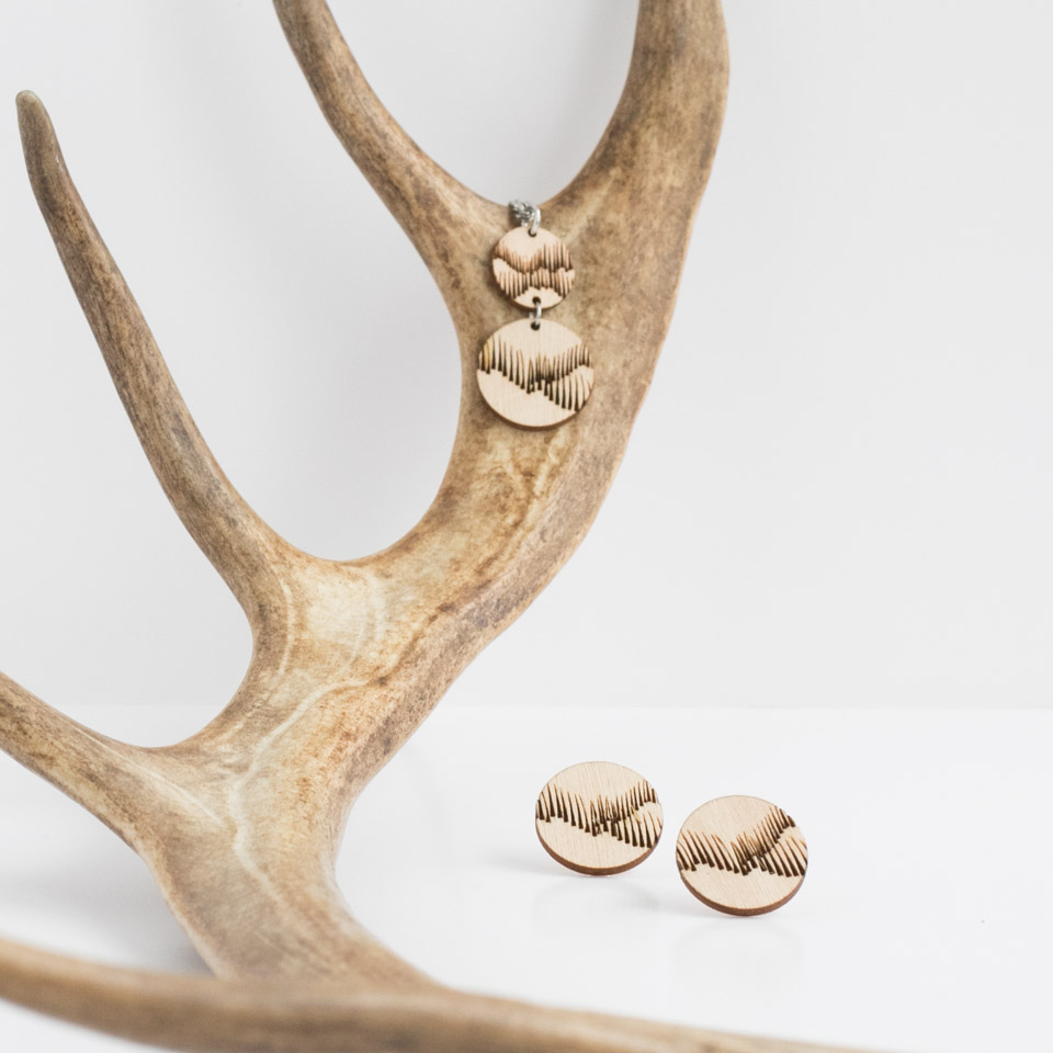Over the years, I’ve spent a lot of time in Lapland, especially at our family cabin in Ylläs. Admiring the Northern Lights (Aurora Borealis) has always been a reason to step out and enjoy the magical winter nightscape, no matter how biting the cold might be. A few years ago, we tried photographing some of my handmade wooden jewelry with the Northern Lights shimmering in the background. That night, the auroras weren’t particularly intense, but they were still beautiful. The photo shoot wasn’t exactly easy — standing still in the cold for long periods is challenging, and that’s what photographing the Northern Lights requires — but we had fun with my friend. The experience stuck with me and sparked new ideas for creating Northern Lights-inspired jewelry.
